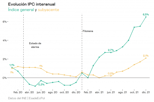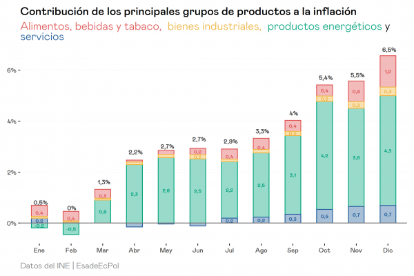 En 2020, el índice de precios de la economía española encadenó 9 meses en terreno negativo. La irrupción de la pandemia, el confinamiento y las posteriores restricciones supusieron que la demanda de determinados productos, como la energía o los servicios turísticos, se hundiera y con ello el índice de precios de la economía. El inicio de la campaña de vacunación a finales de diciembre auguraba que 2021 sería el año de la recuperación. Efectivamente, durante los primeros meses del año el aumento del IPC reflejaba esa recuperación de los niveles pre-covid pero, a partir del segundo trimestre, algo cambió. En abril la tasa de inflación superó el 2% y aceleró su ritmo de crecimiento hasta acabar diciembre en el 6,5%, el valor más alto desde 1992. El caso español no es aislado, por todo el globo encontramos datos similares. En Estados Unidos el IPC de diciembre fue del 7% y la Eurozona batió el récord registrado en 2008 con una tasa de inflación del 5%.