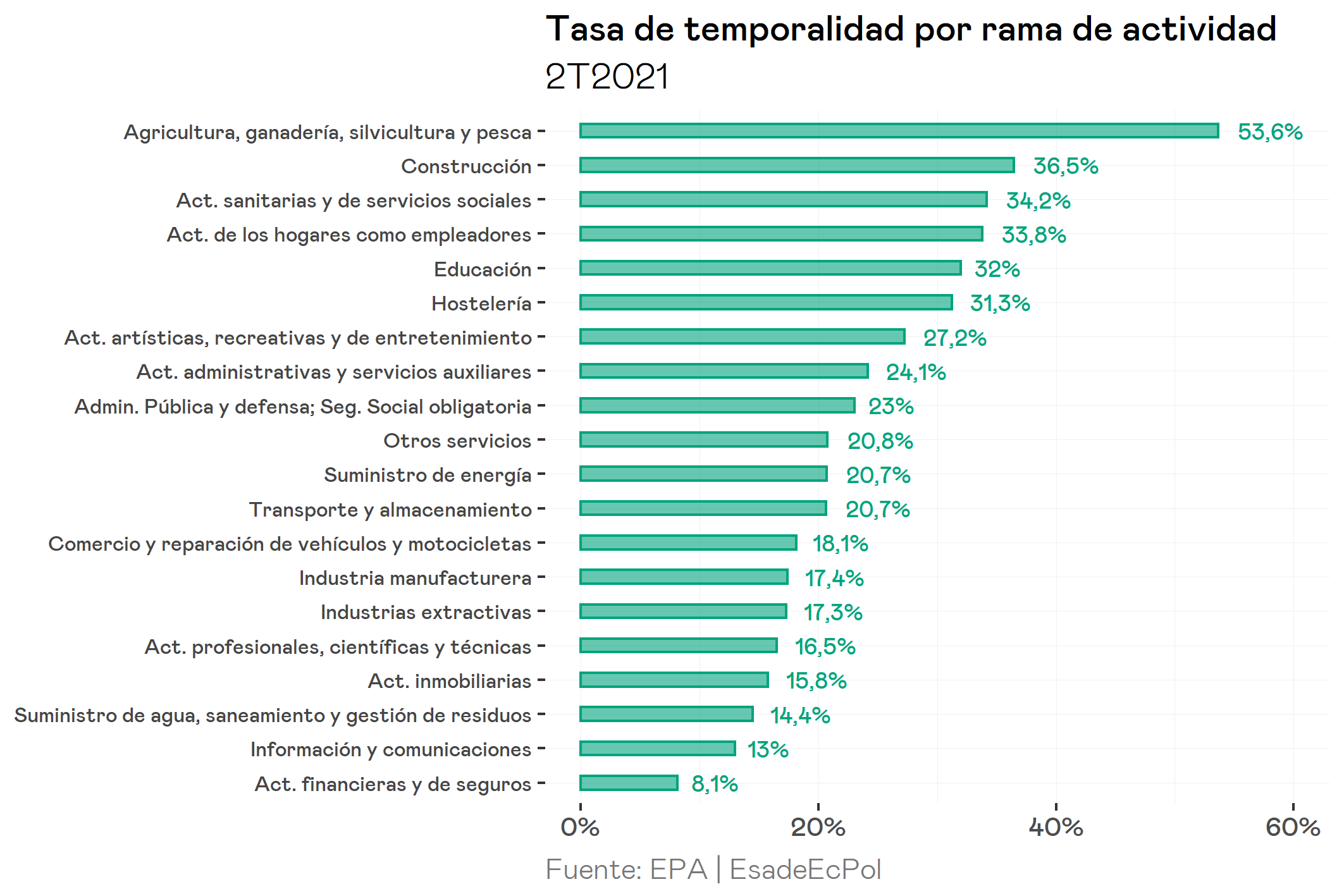 Por otra parte, tal y como muestra el gráfico siguiente, que toma una medida de la temporalidad definida como el porcentaje de asalariados con contrato temporal sobre el total del empleo asalariado de acuerdo con la Encuesta de Población Activa (es decir, ligeramente distinta a la propuesta y, en todo caso, para un trimestre y a nivel de ramas de actividad, no de empresa), el límite previsto, que podría ser incluso menor si así se decide en la negociación colectiva, se encuentra muy por debajo de la cifra de la mayor parte de ramas de actividad, salvo de las actividades financieras y de seguros. En algunos sectores, por tanto, se antoja muy complicado que se pueda alcanzar esta cifra, al menos en el corto plazo: es el caso de la agricultura, ganadería, silvicultura y pesca (53,6%) o la construcción (36,5%), pero también en las actividades sanitarias y de servicios sociales (34,2%).