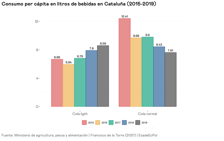 En una investigación citada por el insight, los economistas Judit Vall y Guillem López Casanovas encontraron una disminución del 7’7% en el consumo atribuible al impuesto, evidencia en línea con la observada en otros lugares del mundo. Ahora bien: en tanto que el aumento de precios fue menor en algunos productos, destacan los autores que en ellos no hubo efectos sobre el consumo. En este sentido, será interesante observar qué efecto va a tener (está teniendo ya) el aumento del IVA aplicado a bebidas azucaradas en comercios no hosteleros, del 10% al 21% en toda España desde este mismo año.