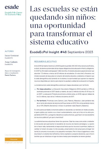 Entre 2013 (el máximo histórico) y 2023 España ha perdido 450.000 niños menores de 16 años, es decir, de alumnos potenciales de las etapas obligatorias de la educación infantil y obligatoria. En 2037 la cifra habrá sobrepasado 1 millón de niños. El sistema educativo pasará de tener que absorber 7,5 millones a menos de 6,5 millones de estudiantes. En este brief, ofrecemos una mirada necesaria de largo plazo al conjunto del sistema educativo, analizamos el impacto que la caída demográfica está teniendo en el sistema y la oportunidad que suponen los mayores recursos disponibles por alumno para mejorar la equidad y calidad de la educación en España.