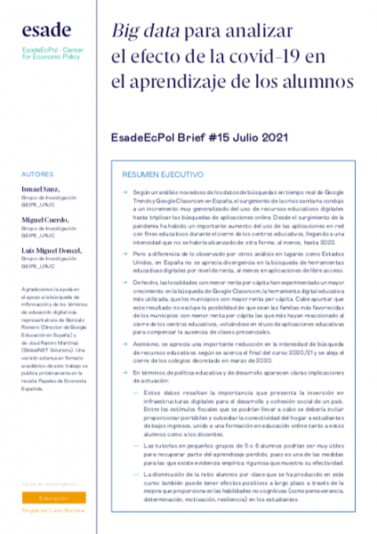 Según un análisis novedoso de los datos de búsquedas en tiempo real de Google Trends y Google Classroom en España, el surgimiento de la crisis sanitaria condujo a un incremento muy generalizado del uso de recursos educativos digitales hasta triplicar las búsquedas de aplicaciones online. Desde el surgimiento de la pandemia ha habido un importante aumento del uso de las aplicaciones en red con fines educativos durante el cierre de los centros educativos, llegando a una intensidad que no se habría alcanzado de otra forma, al menos, hasta 2022.