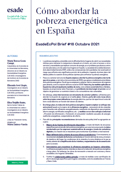 → La pobreza energética, entendida como la dificultad de los hogares de cubrir sus necesidades mínimas para mantener la temperatura deseada en el mismo, así como el acceso a otros servicios y necesidades que implican consumo de energía, es un problema que alcanza a entre uno de cada siete y uno de cada trece hogares en España. La escalada de la subida del precio de la electricidad durante 2021, unida a las consecuencias de la pandemia, han acentuado el riesgo que enfrenta esta significativa porción de la población, trayendo al primer plano del debate público la cuestión de las políticas óptimas para enfrentar la pobreza energética.