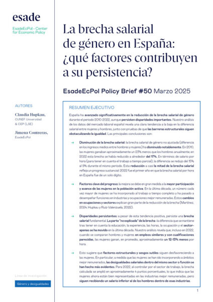Aquest impacte durador de les responsabilitats de cura sobre les carreres de les dones, juntament amb efectes del sostre de vidre en càrrecs directius, fa que la igualtat salarial per la mateixa feina encara no sigui una realitat. En resum, la convergència de gènere s’ha estancat en l’últim tram: després de reduir la bretxa gràcies a millores en educació, experiència i accés a millors feines, la desigualtat restant està vinculada a qüestions més complexes com les compensacions entre feina i família, els biaixos implícits i la cultura organitzacional.