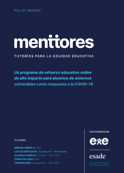 → La evidencia acumulada en más de 100 estudios experimentales muestra que los programas de tutorías individualizadas de refuerzo educativo son, junto a la educación de 0 a 3 años, la inversión educativa más efectiva. Desde EsadeEcPol y la Fundación Empieza Por Educar (ExE) pusimos en marcha, durante la primavera de 2021, el programa Menttores, un programa innovador de tutorías individualizadas online de refuerzo extraescolar gratuito, para apoyar a y más castigado por la COVID-19.