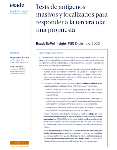 - Aquestes millores s’aconseguirien mitjançant una inversió relativament petita: un 10% més de proves seria suficient. A més, considerem el test doble, una estratègia alternativa que permetria reduir al màxim els falsos negatius. Aquesta estratègia podria ser particularment adequada per a zones “vermelles”, és a dir, aquelles àrees més petites en què el nivell de contagi és intens (ciutats, districtes o províncies).
