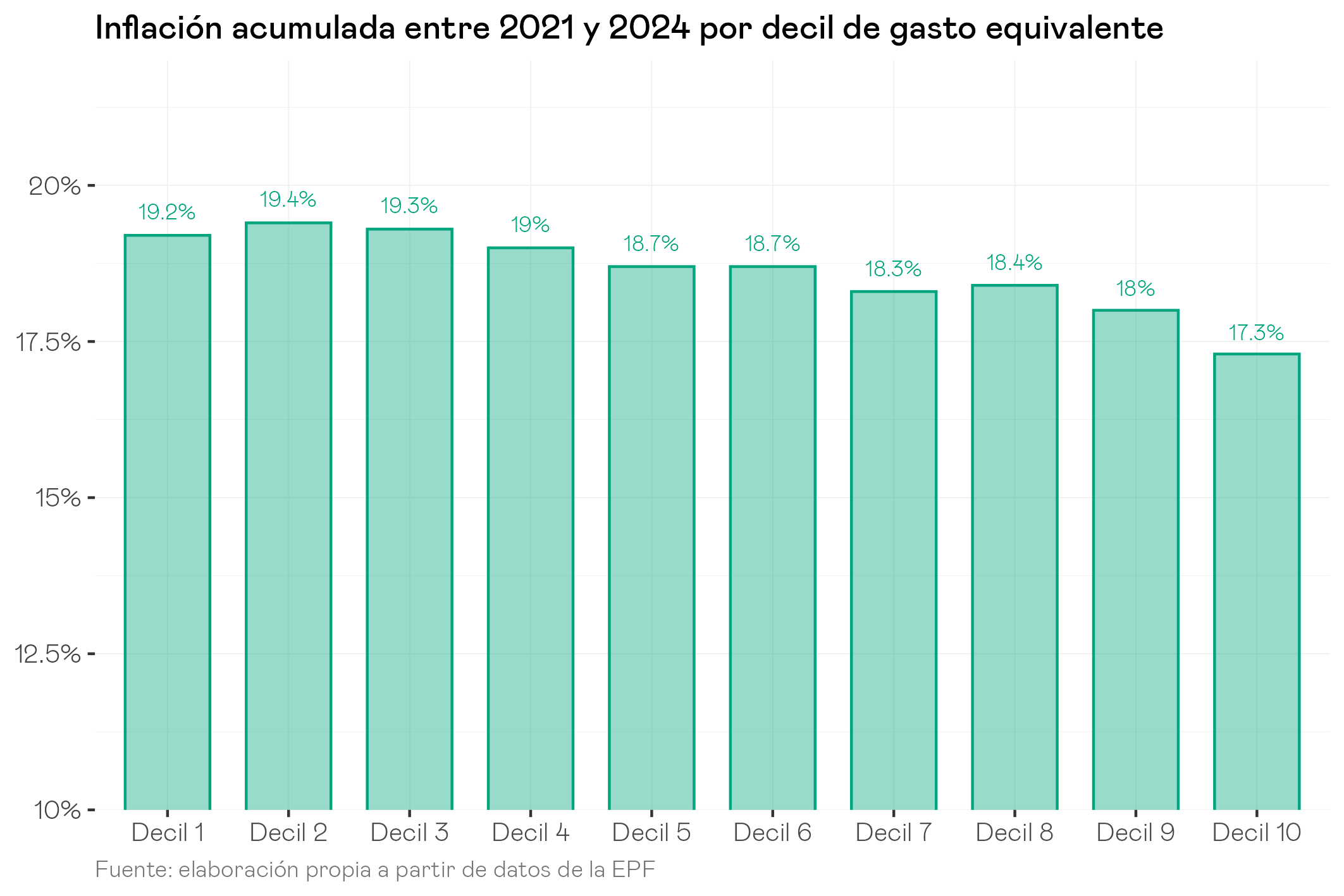 Aunque en el periodo 2021-2023 la imagen no estaba del todo clara, parece que el 2024 inclina la balanza hacia un efecto distributivo de la inflación ligeramente regresivo en los últimos años, con una inflación acumulada para los deciles mas bajos que roza el 20%.