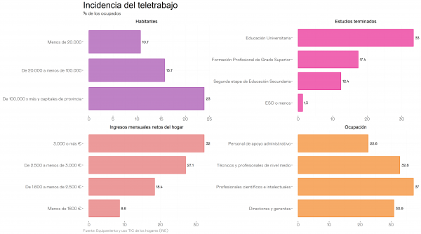 También se observa una brecha en términos de ocupación, siendo la categoría con una menor incidencia del teletrabajo la del personal de apoyo administrativo, con aproximadamente un 23% frente al 37% entre profesionales científicos e intelectuales. En cuanto al tamaño del municipio, también existe una relación positiva este y la incidencia del teletrabajo: entre los municipios de más de 100.000 habitantes la tasa es el doble que en los municipios de menos de 20.000.