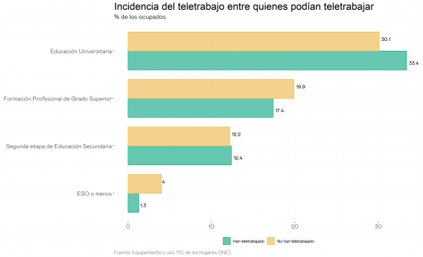 Es decir, aunque la mayoría de las diferencias en la incidencia del teletrabajo entre grupos de estudio y renta se pueden explicar por las características del empleo, hay una parte más pequeña pero relevante que puede explicarse porque, de entre los pocos trabajadores con baja cualificación que podrían trabajar, el porcentaje de ellos que finalmente teletrabajan es especialmente bajo.