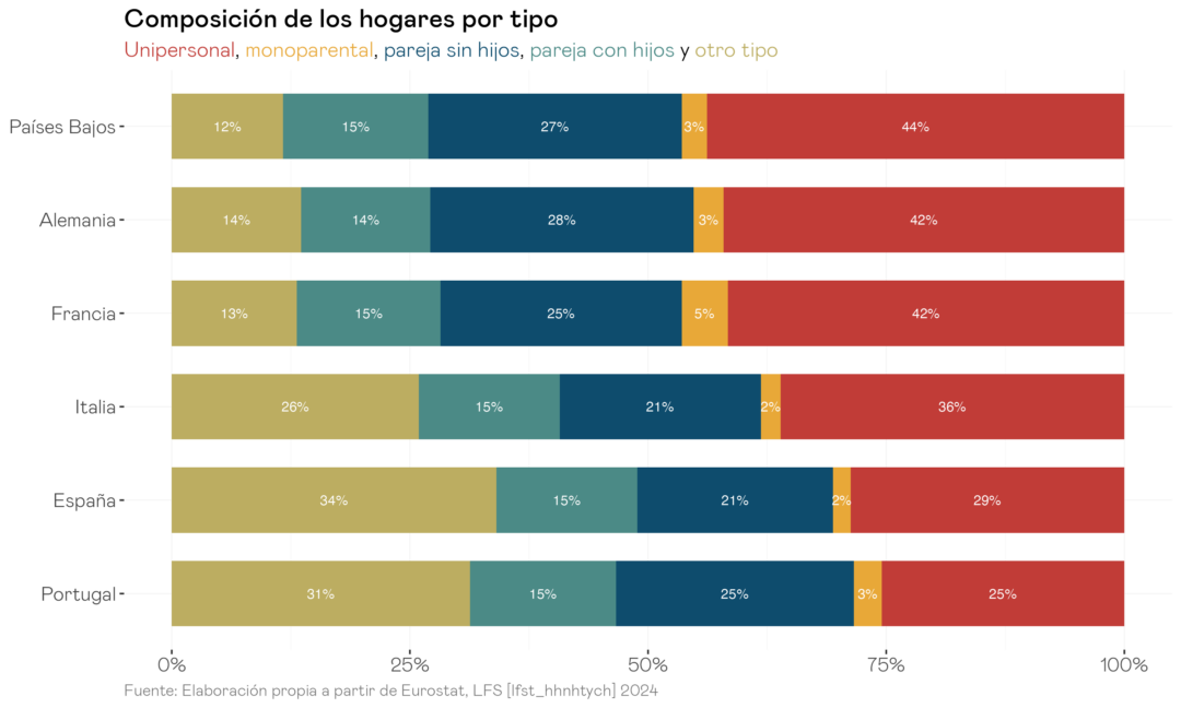 Vivir solo ya no es la excepción. En 2024, alrededor del 37% de los hogares de la Unión Europea eran personas que vivían solas sin hijos, el tipo de hogar más numeroso de toda la Unión. Como muestra el gráfico, España se aproxima a esa media con un 29% de hogares unipersonales, pero acumula una brecha de 13 puntos porcentuales respecto a Alemania o Francia. En cambio, en España el tipo de hogar más frecuente es el que Eurostat clasifica como “otros tipos”, que agrupa a dos o más adultos que no forman pareja (hijos adultos que conviven con sus padres o personas que comparten vivienda), un reflejo de las dificultades de emancipación. Aun así, el 29% es una cifra considerable y en ascenso.
