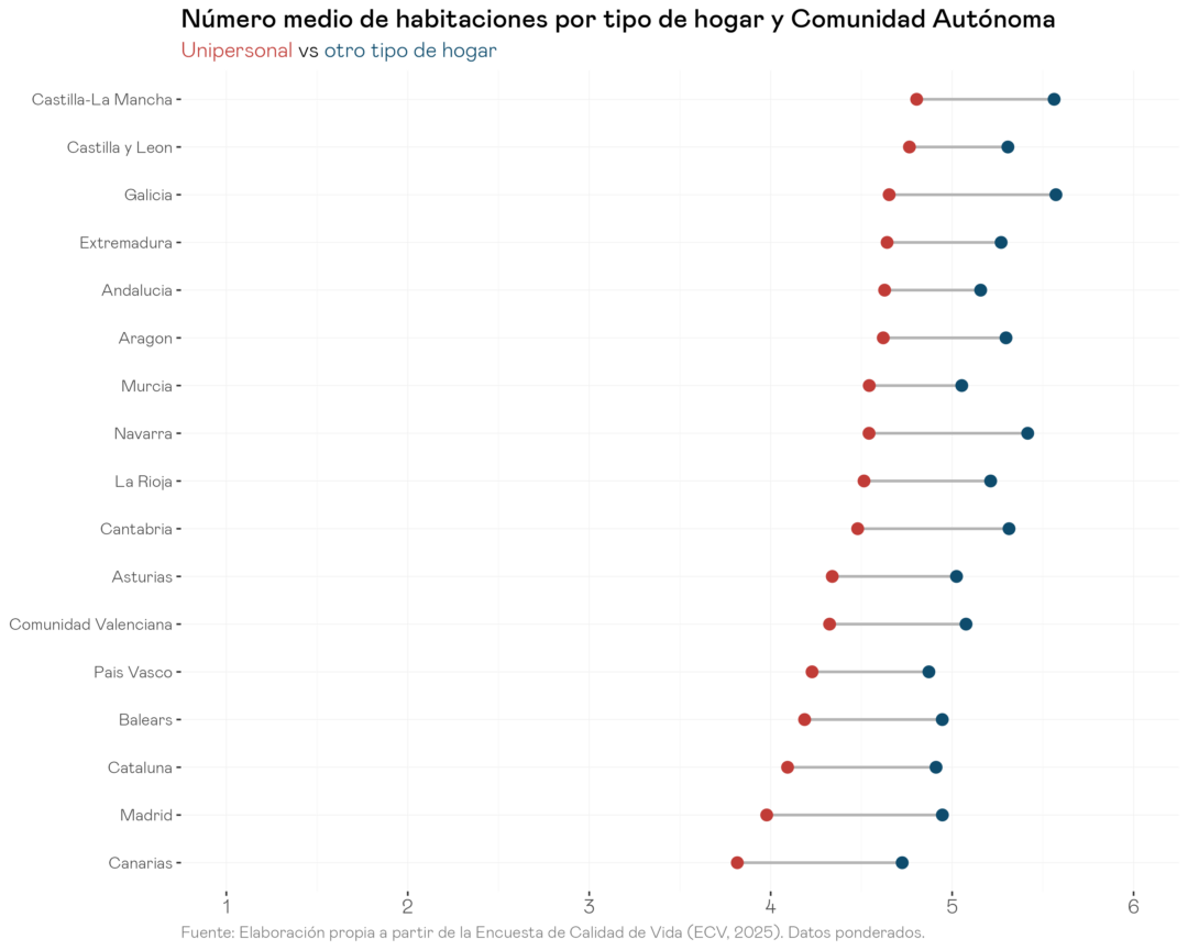 El desglose por comunidades autónomas confirma que el sobredimensionamiento es un patrón estructural que se repite en todo el territorio: en ninguna CCAA la media de los hogares unipersonales baja de las 4 habitaciones. La brecha respecto a otros tipos de hogar es además relativamente constante en todas las regiones, lo que apunta a un desajuste del parque residencial español más que a dinámicas locales específicas. Castilla-La Mancha, Galicia y Castilla y León presentan las medias más elevadas, mientras Canarias y Madrid se sitúan en el extremo inferior, aunque incluso allí el valor ronda las 4 habitaciones.