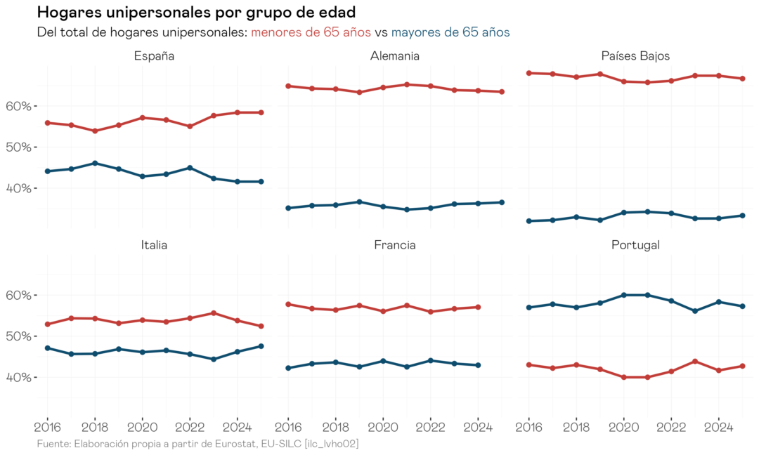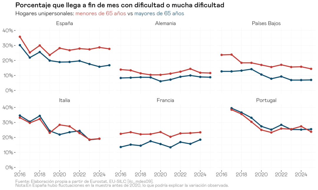 Al desglosar por mayores y menores de 65, emerge una fractura que se repite en todos estos países europeos: en España, Alemania, Países Bajos y Francia, los hogares unipersonales menores de 65 años tienen sistemáticamente más dificultades para llegar a fin de mes que los mayores. En el caso de España, esta brecha tiene además una trayectoria preocupante: desde 2020, la proporción de hogares unipersonales menores de 65 años con dificultades ha escalado hasta cerca del 30%, mientras la de los mayores de 65 se ha mantenido por debajo del 20%. Este patrón no implica que los mayores estén exentos de vulnerabilidad económica, sino que los menores presentan una dificultad desproporcionada que merece atención específica.