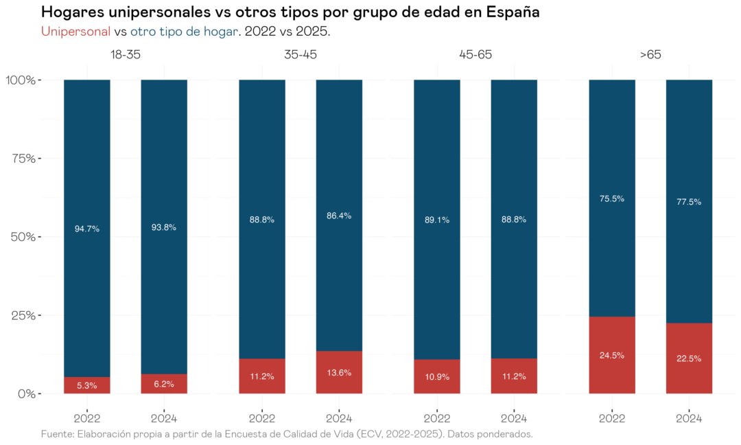 Al desagregar por grupos de edad, el crecimiento de los hogares unipersonales se concentra principalmente en el tramo de 35 a 45 años, que pasa del 11,2% al 13,1% entre 2022 y 2025. Entre los más jóvenes, de 18 a 35 años, el aumento es menor —del 5,3% al 6,4%—, pero debe interpretarse en el contexto de las dificultades de emancipación que atraviesa este grupo en España. De hecho, solo un tercio de los jóvenes españoles estaba emancipado en el 2025, el mínimo histórico de la serie de la propia Encuesta de Condiciones de Vida. Se podría decir, entonces, que de los pocos que logran emanciparse, una parte creciente lo hace para formar un hogar unipersonal.