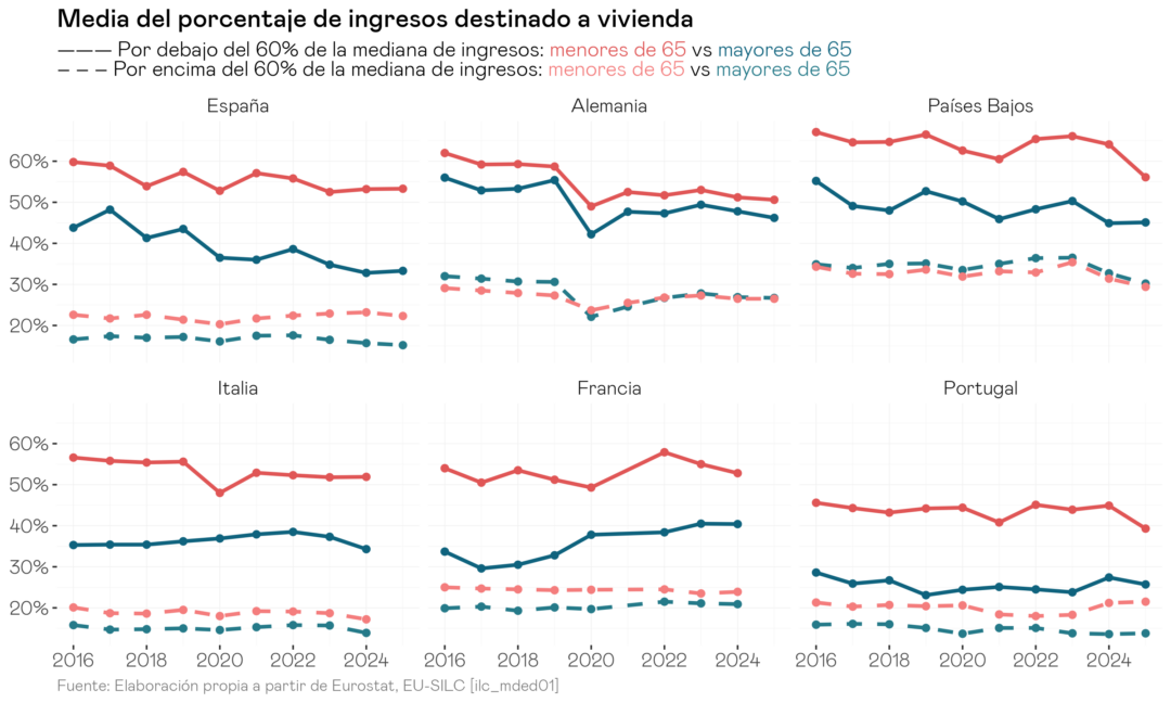 → Para los hogares unipersonales menores de 65 con renta baja, el coste residencial roza o supera el 60% de los ingresos en los grandes países europeos, muy por encima del umbral de sobrecarga del 40%: es la “prima de soledad”.