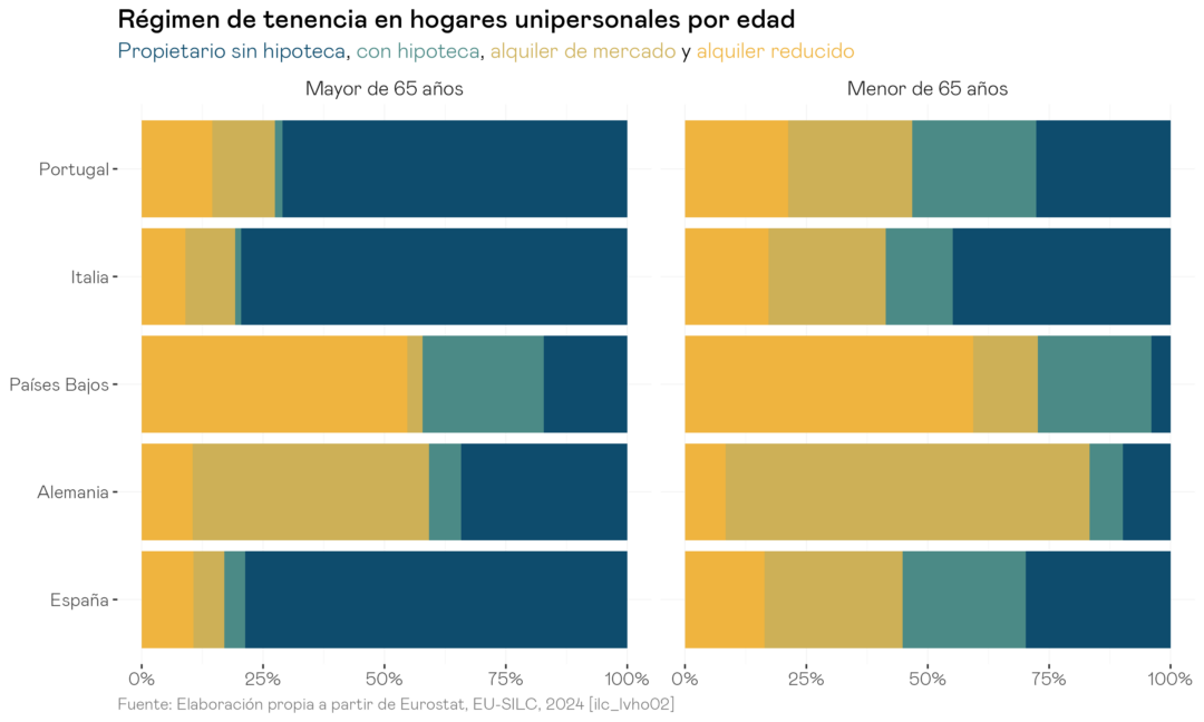 → La asimetría generacional se refuerza por el régimen de tenencia: en España (e Italia y Portugal) una proporción muy alta de mayores de 65 son propietarios sin hipoteca, mientras los jóvenes se reparten entre alquiler y propiedad con hipoteca. En contraste, en Alemania o Países Bajos el alquiler es mayoritario de manera homogénea entre generaciones.