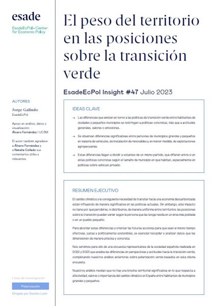 El cambio climático y la consiguiente necesidad de transitar hacia una economía descarbonizada están influyendo de manera significativa en las políticas actuales. Sin embargo, este impacto no tiene por qué percibirse, ni distribuirse, de manera uniforme entre territorios: las posiciones sobre la transición pueden variar según la persona que las tenga resida en un área más poblada o en un pueblo pequeño.