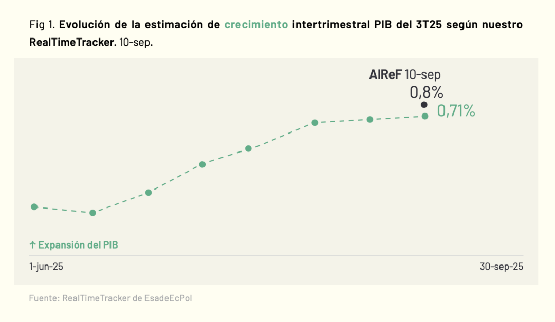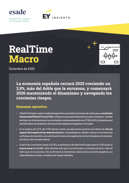 • El perfil de crecimiento hasta el 3T25 y la estimación del RealTimeTracker para el 4T25 sitúan el avance anual en el 2,9%, siete décimas más que lo pronosticado a principios de año y más del doble que en la eurozona. Ello confirmaría la resistencia relativa de la economía española y su capacidad para sortear un balance de riesgos elevados.