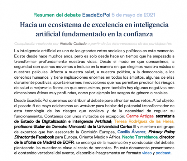 La inteligencia artificial es uno de los grandes retos sociales y políticos en este momento. Y desde EsadeEcPol queremos contribuir al debate para afrontar este reto. A tal objeto, el pasado 5 de mayo celebramos un webinar para hablar del potencial transformador de esta tecnología de los riesgos que conlleva y de la necesidad de regular su funcionamiento. Contamos con unos invitados de excepción: Carme Artigas, secretaria de Estado de Digitalización e Inteligencia Artificial; Teresa Rodríguez de las Heras, profesora titular de Derecho Mercantil de la Universidad Carlos III y miembro del grupo de expertos que han asesorado la Comisión Europea, Cecilia Álvarez, Privacy Policy Director de Facebook para Europa, Oriente Medio y África. Nacho Torreblanca, director de la oficina de Madrid de ECFR; se encargó de la moderación y conducción del debate, planteando las cuestiones clave al resto de ponentes.