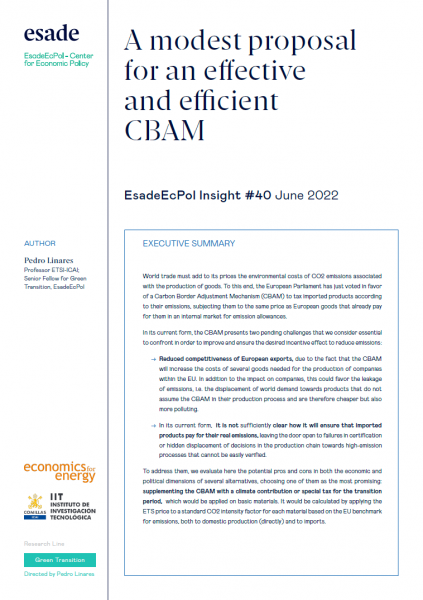 To address them, we evaluate here the potential pros and cons in both the economic and political dimensions of several alternatives, choosing one of them as the most promising: supplementing the CBAM with a climate contribution or special tax for the transition period, which would be applied on basic materials. It would be calculated by applying the ETS price to a standard CO2 intensity factor for each material based on the EU benchmark for emissions, both to domestic production (directly) and to imports.