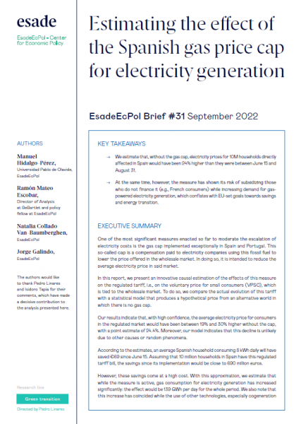 In this report, we present an innovative causal estimation of the effects of this measure on the regulated tariff, i.e., on the voluntary price for small consumers (VPSC), which is tied to the wholesale market. To do so, we compare the actual evolution of this tariff with a statistical model that produces a hypothetical price from an alternative world in which there is no gas cap.