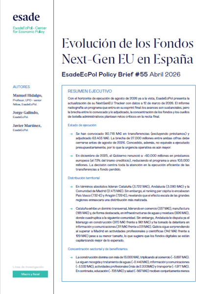 With the execution deadline of August 2026 already in sight, EsadeEcPol presents the update of its NextGenEU Tracker with data as of 12 March 2026. The report examines a programme entering its final sprint: progress is substantial, but the gap between called and awarded funds, fund concentration, and administrative bottlenecks pose critical challenges in the home stretch.