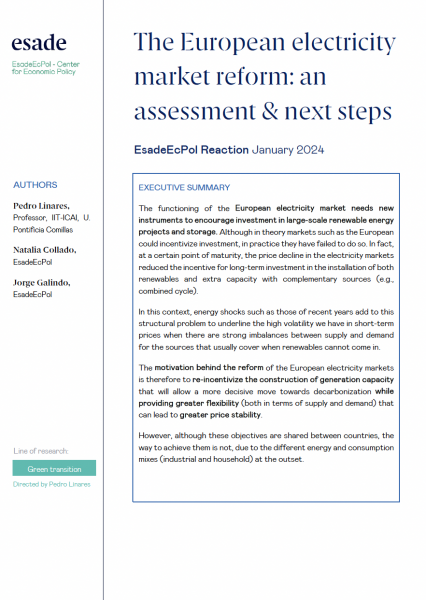 Linares, P.; Collado, N.; Galindo, J. (2024). The European electricity market reform: an assessment & next steps. EsadeEcPol Policy Reaction January 2024, Esade. http://www.doi.org/10.56269/20240115/PL