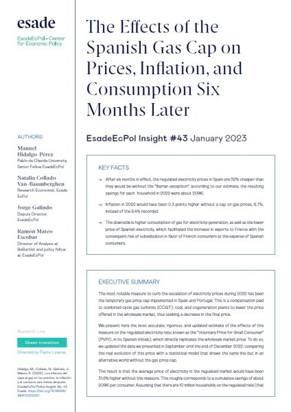 Hidalgo, M.; Collado, N.; Galindo, J.; Mateo, R. (2023). The Effects of the Spanish Gas Cap on Prices, Inflation, and Consumption Six Months Later. EsadeEcPol Policy Insight, No. 43, Esade. https://doi.org/10.56269/20230202/mhp