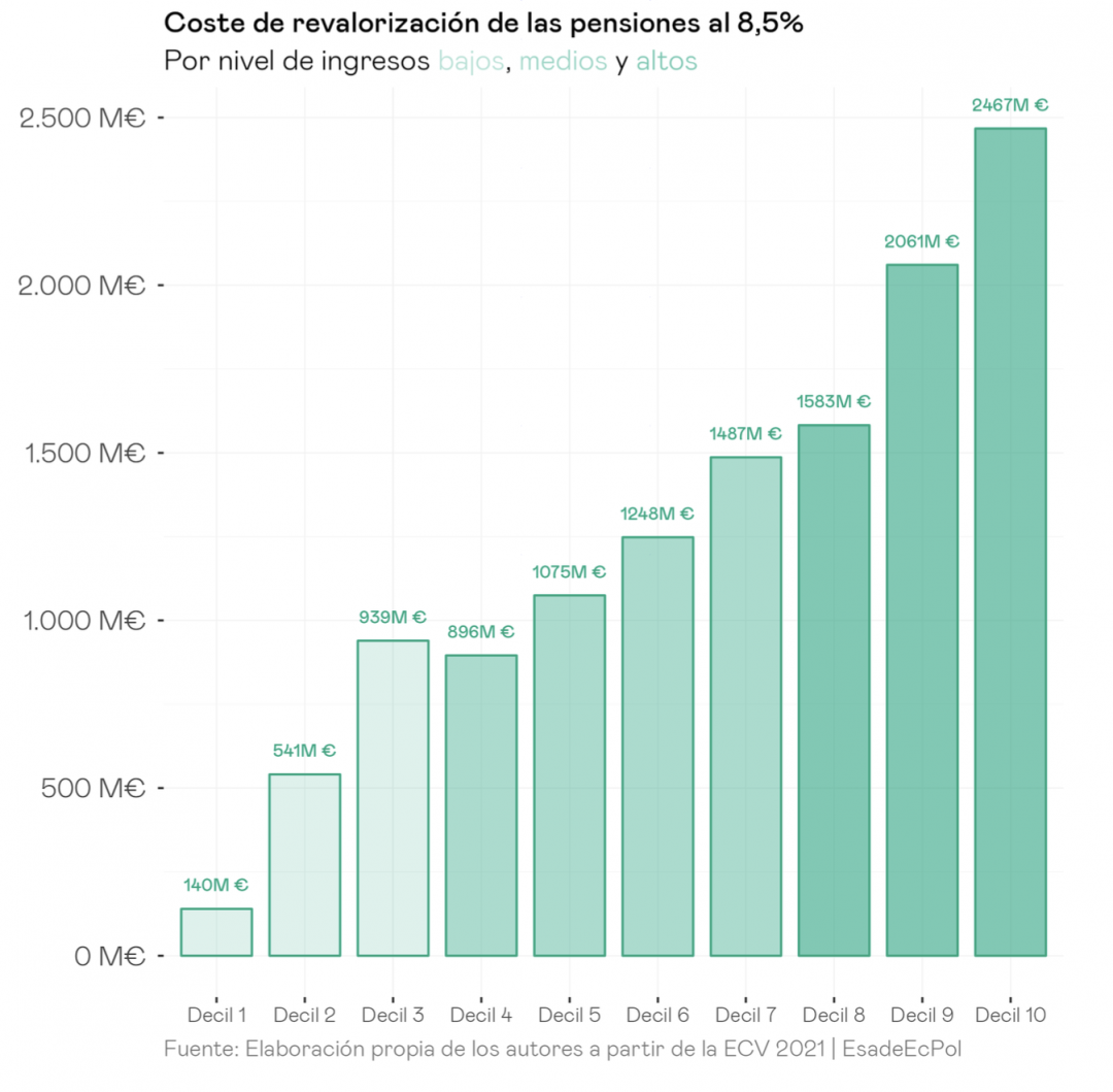 Además, sería oportuno tener una reflexión más de fondo sobre una de las razones más importantes pero menos comentadas para el recurso a medidas rápidas: la mayor partida de gasto estructural en los Presupuestos, las pensiones, está atada al IPC. Una escalada desbocada del mismo supondría un incremento tan brutal como inesperado y permanente de la misma. Probablemente esta fue una motivación central para varias de las medidas aquí evaluadas. Y, a pesar de eso, acabamos con un incremento sustancial (que tiene los mismos problemas arriba descritos: destinó más cantidad de dinero a hogares de mayor renta).