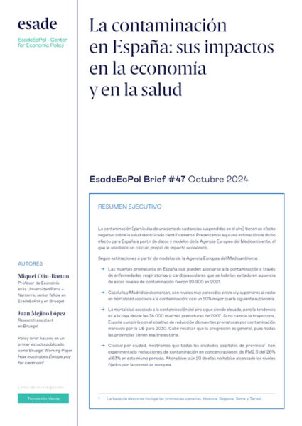 - Si la contaminación estuviera por debajo de los niveles marcados por la OMS como máximos recomendables (5 microgramos por metro cúbico de aire), la economía española podría haber experimentado un crecimiento sustancialmente mayor, hasta del 5% más en el período analizado. Esto es ligeramente inferior al impacto medio estimado en la UE (6%), donde sobresalen Italia (9%) y Europa del Este (10%).