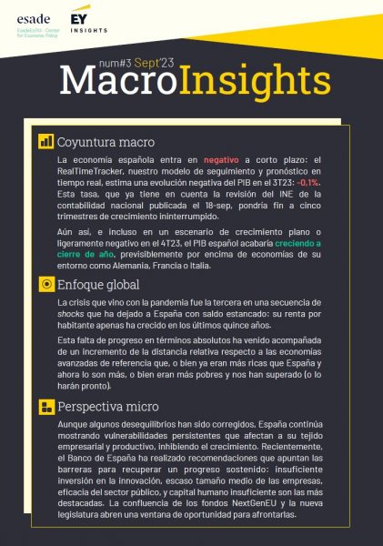 La economía española entra en negativo a corto plazo: el RealTimeTracker, nuestro modelo de seguimiento y pronóstico en tiempo real, estima una evolución negativa del PIB en el 3T23: -0,1%. Esta tasa, que ya tiene en cuenta la revisión del INE de la contabilidad nacional publicada el 18-sep, pondría fin a cinco trimestres de crecimiento ininterrumpido. Aún así, e incluso en un escenario de crecimiento plano o ligeramente negativo en el 4T23, el PIB español acabaría creciendo a cierre de año, previsiblemente por encima de economías de su entorno como Alemania, Francia o Italia.
