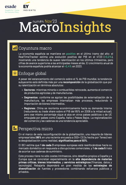 La economía española se mantiene en positivo en el último tramo del año: el RealTimeTracker estima una evolución positiva del PIB en el 4T23 (+0,2%), mostrando una tendencia de suave ralentización en los últimos trimestres, pero cifras de avance superiores a las anticipadas meses atrás. El crecimiento anual de la economía española podría alcanzar el +2,4% en 2023.