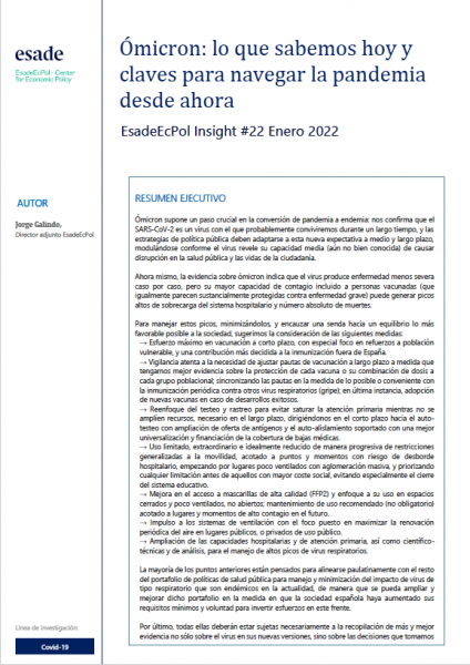 Ómicron supone un paso crucial en la conversión de pandemia a endemia: nos confirma que el SARS-CoV-2 es un virus con el que probablemente conviviremos durante un largo tiempo, y las estrategias de política pública deben adaptarse a esta nueva expectativa a medio y largo plazo, modulándose conforme el virus revele su capacidad media (aún no bien conocida) de causar disrupción en la salud pública y las vidas de la ciudadanía.