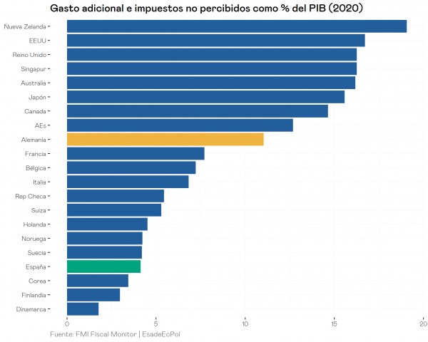 Esta situación ha motivado a los gobiernos a emprender políticas fiscales expansivas en forma de mayor gasto público y menores impuestos con el fin de recapitalizar al sector empresarial y sostener el consumo de las familias que han perdido renta durante la pandemia. En el caso de España buena parte de ese incremento del gasto ha venido a través de los Expedientes de Regulación Temporal de Empleo (ERTEs) para las empresas y las ayudas por cese de actividad para los autónomos. A pesar de ello, según el FMI España es uno de los países con una política fiscal menos ambiciosa, a pesar de estar recibiendo un castigo desproporcionadamente grande tanto en la dimensión económica como en la sanitaria.