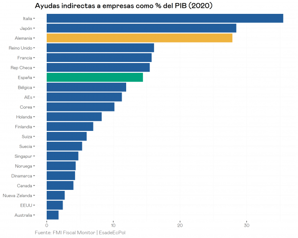España es una de las economías avanzadas con una menor reacción por parte de su sector público, que apenas ha destinado un 4% del PIB a su paquete de estímulos. Frente al 4% de España, países con caídas menores del PIB como Francia y Alemania han gastado un 11% y un 7,7% del PIB respectivamente, triplicando y duplicando respectivamente la inversión española. De este 4%, aproximadamente una décima parte (0,4 % del PIB) es gasto sanitario, esencialmente compras de material sanitario al exterior, un % similar al del resto de países. La debilidad del paquete de estímulo del gobierno español se explica esencialmente por la carecía de ayudas directas a las empresas más allá de los ERTEs: en Alemania, por ejemplo, las empresas con una caída en la facturación de más del 70% respecto a 2019 se han beneficiado de cuantiosas ayudas directas que llegaban al 70% de los costes fijos de la compañía. La evidencia empírica más reciente indica que estas ayudas han resultado en una disminución sustancial del número de quiebras empresariales en 2020, pero sin distorsionar el proceso de quiebras evitando así que las empresas subvencionadas pudieran convertirse en el futuro en empresas zombi.