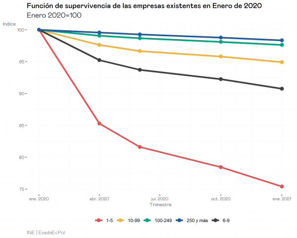 Un nivel de heterogeneidad similar se observa en las tasas de supervivencia empresarial según el numero de trabajadores de la empresa. Una de cada 4 empresas con menos de 5 trabajadores ha desaparecido frente a un 9% de las empresas que cuentan con entre 6 y 9 empleados. Adoptando también esta idea de que son las Pymes quienes tienen pueden tener más dificultades de liquidez en el corto plazo por la dificultad del acceso al crédito el gobierno ha especificado que la mayoría de las ayudas se destine a este conjunto de empresas.