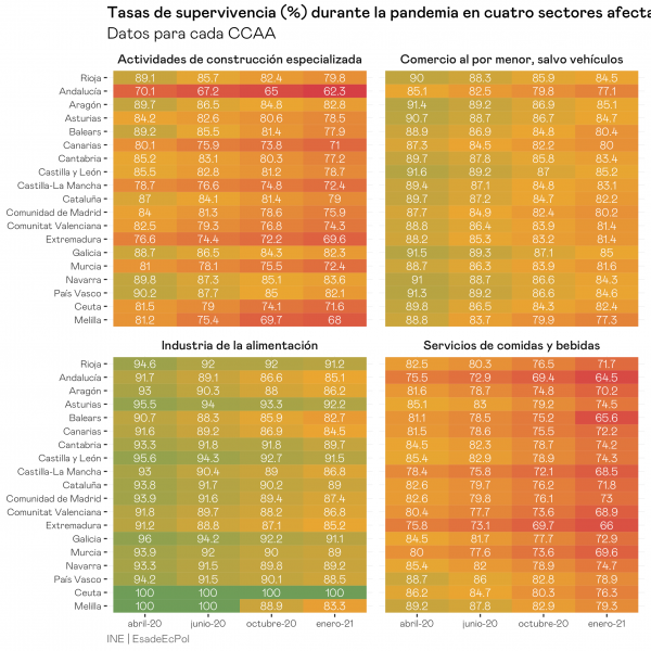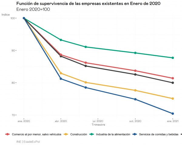 La gran mayoría de las empresas se perdieron entre el 1 de enero y el 1 de abril de 2020, esencialmente el periodo que abarca las primeras semanas de confinamiento. Desde ese momento las tasas de destrucción de empresas se han moderado hasta llegar a un par de puntos por trimestre. Es interesante notar que los sectores especialmente afectados por las restricciones aprobadas a final de año tuvieron un repunte en la tasa de destrucción (una caída más acusada en la tasa de supervivencia), concretamente más de un 15% de las empresas de restauración que se destruyeron a lo largo de 2020 lo hicieron entre comienzos de octubre y final de año.