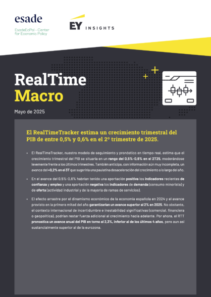 • El RealTimeTracker, nuestro modelo de seguimiento y pronóstico en tiempo real, estima que el crecimiento trimestral del PIB se situaría en un rango del 0,5%-0,6% en el 2T25, moderándose levemente frente a los últimos trimestres. También anticipa, con información aún muy incompleta, un avance del +0,2% en el 3T que sugeriría una paulatina desaceleración del crecimiento a lo largo del año.