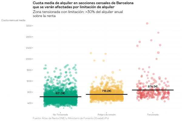 En Barcelona el precio medio de las zonas tensionadas es algo más elevado respecto al resto de zonas, aunque presenta valores parecidos a los encontrados en Madrid, con un alquiler medio en las zonas tensionadas de 875€ mensuales igualmente sesgado por unos pocos valores atípicos. Donde sí se observa una diferencia respecto a Madrid es en el precio de las zonas no tensionadas, que es inferior y llega a los 630€.