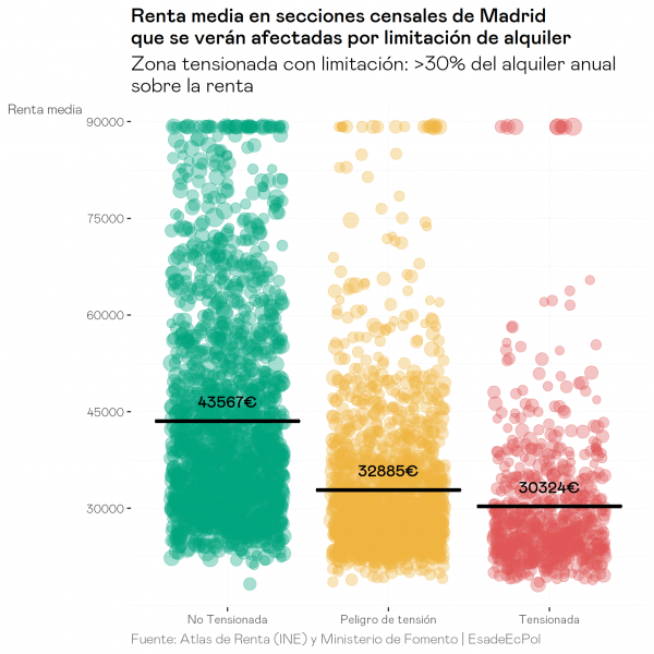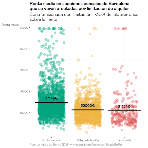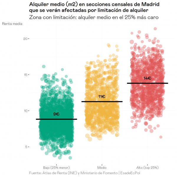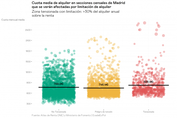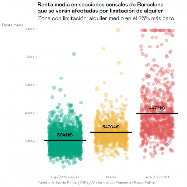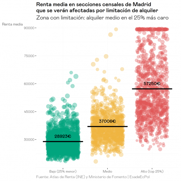 - Si el límite se establece con un criterio único de precio, las zonas con alquileres más elevados se sitúan en zonas de rentas más altas que la media, dado que existe una fuerte correlación entre el nivel de renta y el precio de los alquileres a nivel de sección censal. En consecuencia, una intervención en el mercado para limitar los precios en las zonas más caras de Madrid y Barcelona no beneficiaría a inquilinos de rentas bajas sino más bien a hogares de rentas medias-altas. Sería, pues, una medida poco equitativa.