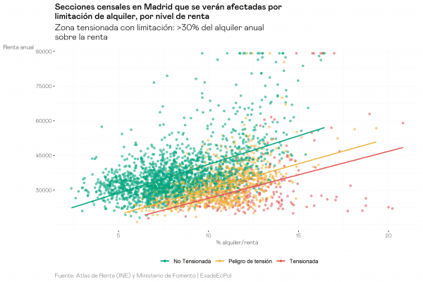 Una manera propuesta a menudo para esquivar este tipo de problema sería definir la activación del tope en el alquiler en términos relativos, no absolutos: como porcentaje aproximado que represente el pago de la cuota sobre la renta de los hogares. Este es el mecanismo establecido en Cataluña desde septiembre de 2020, y una versión es la que analizamos aquí: una norma que regularía automáticamente los precios de alquiler en áreas (secciones censales en este caso) donde esté suponiendo más de un 30% de la renta media por hogar. A efectos analíticos distinguimos también un punto intermedio, de riesgo de tensión: allá donde la cuota sea menos de un 30% pero más de un 25% de la renta media.